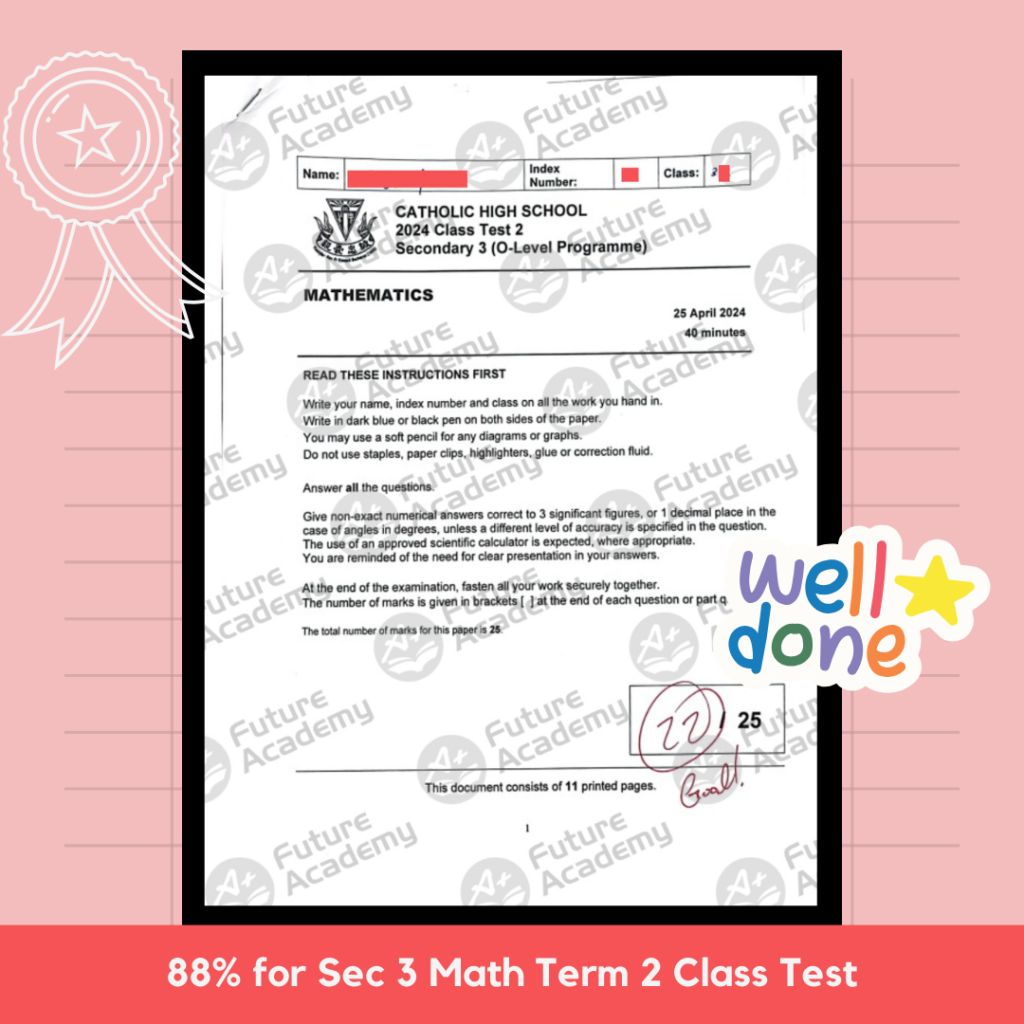 Student A is an SCGS Sec 2 student who used to dislike math and did badly in it. But she experienced a turning point when she joined the Secondary Math Tuition in Future Academy. Soon, she picked up concepts which she once struggled with, and saw tremendous improvements in just 6 months! Most recently, she topped her class with 90% for her math class test – amazing!