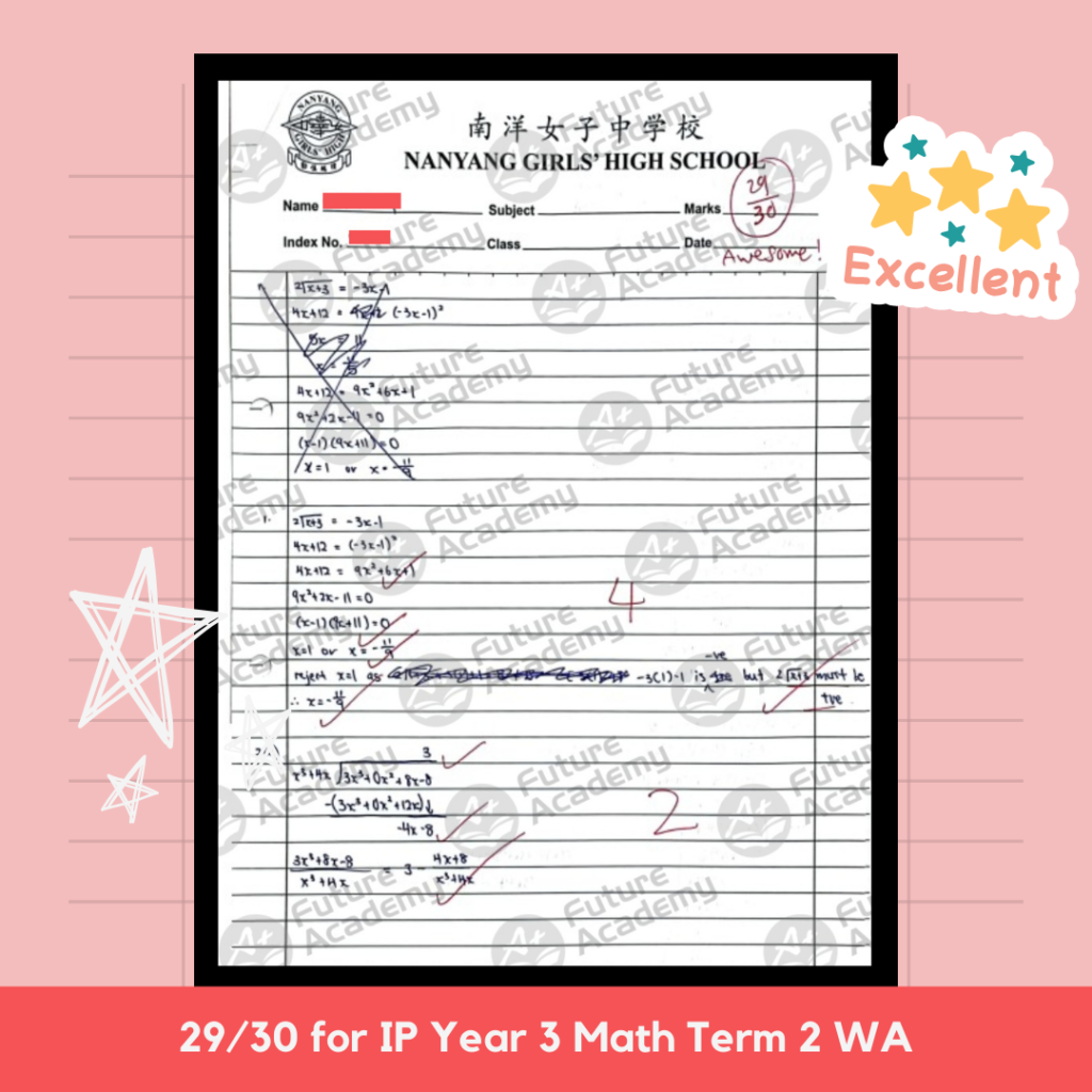 Student K, an RGS Sec 4 student attending our IP Math Tuition, scored an impressive 90% for her math 2 class test! It is a marvellous feat considering the difficulty of RGS papers and the self-directed learning style that the school has adopted. With the help of systematic teaching and practices in Future Academy, she was able to excel even despite the challenging curriculum!