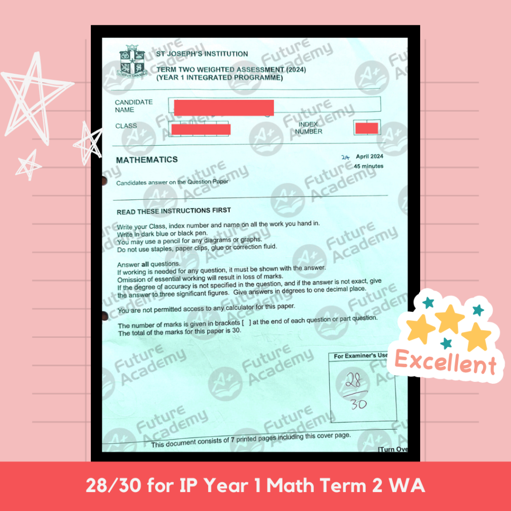 Student L is an MGS student in the IP (IB) track who considers herself more of a language person rather than a math person. Initially lacking in confidence for math, she has made steady progress since enrolling in Future Academy. At her most recent math WA, she scored 29/30 marks!