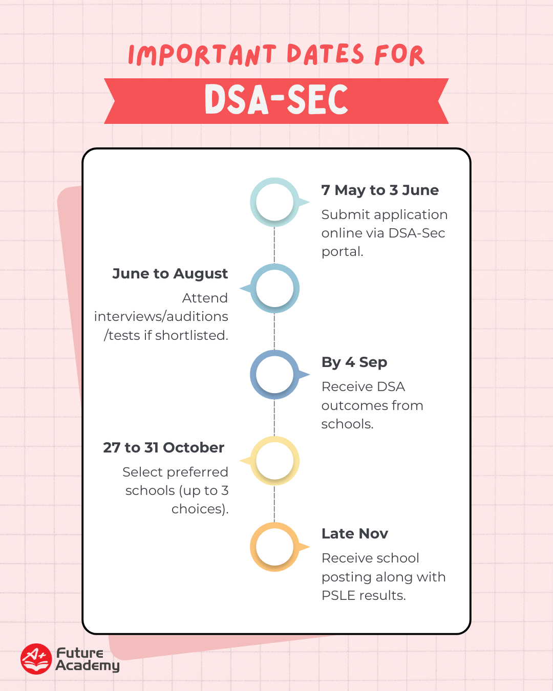If applying to DSA-Sec is on your mind this year, it’s important to take note of the process and timeline for application – as it is coming up quite soon! Most years, the application takes place in May. Shortlisted applicants will be contacted for interviews, auditions, and placement tests (depending on the talent area) in the following months.