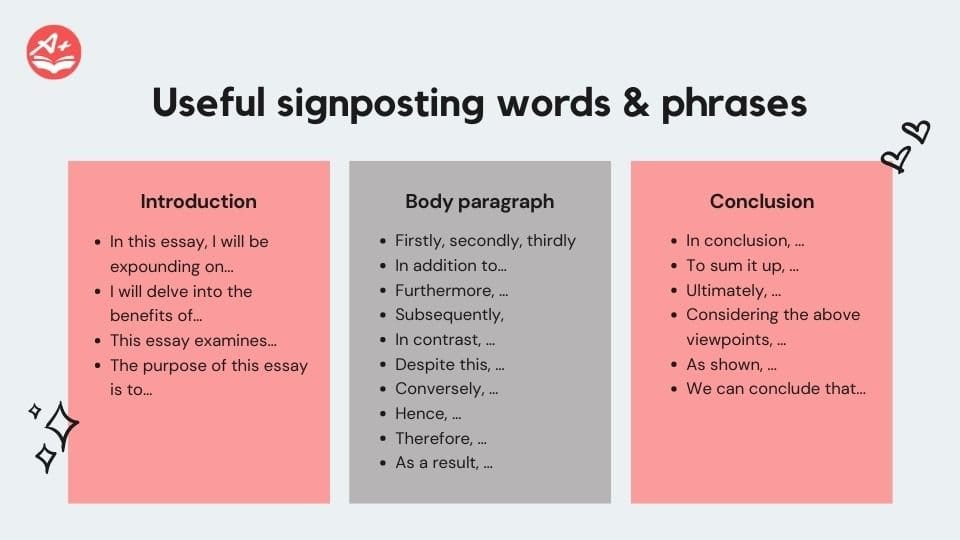 Signposting are words and phrases that direct the flow of your essay. This helps readers better understand the line of reasoning you are presenting to them. Only when your reader can understand can they begin to be convinced of what you are saying!