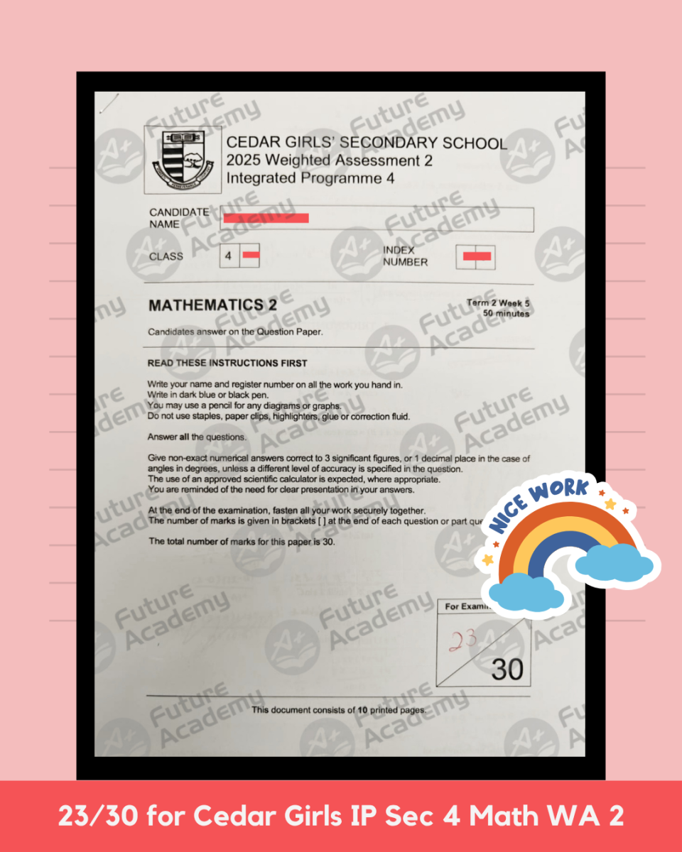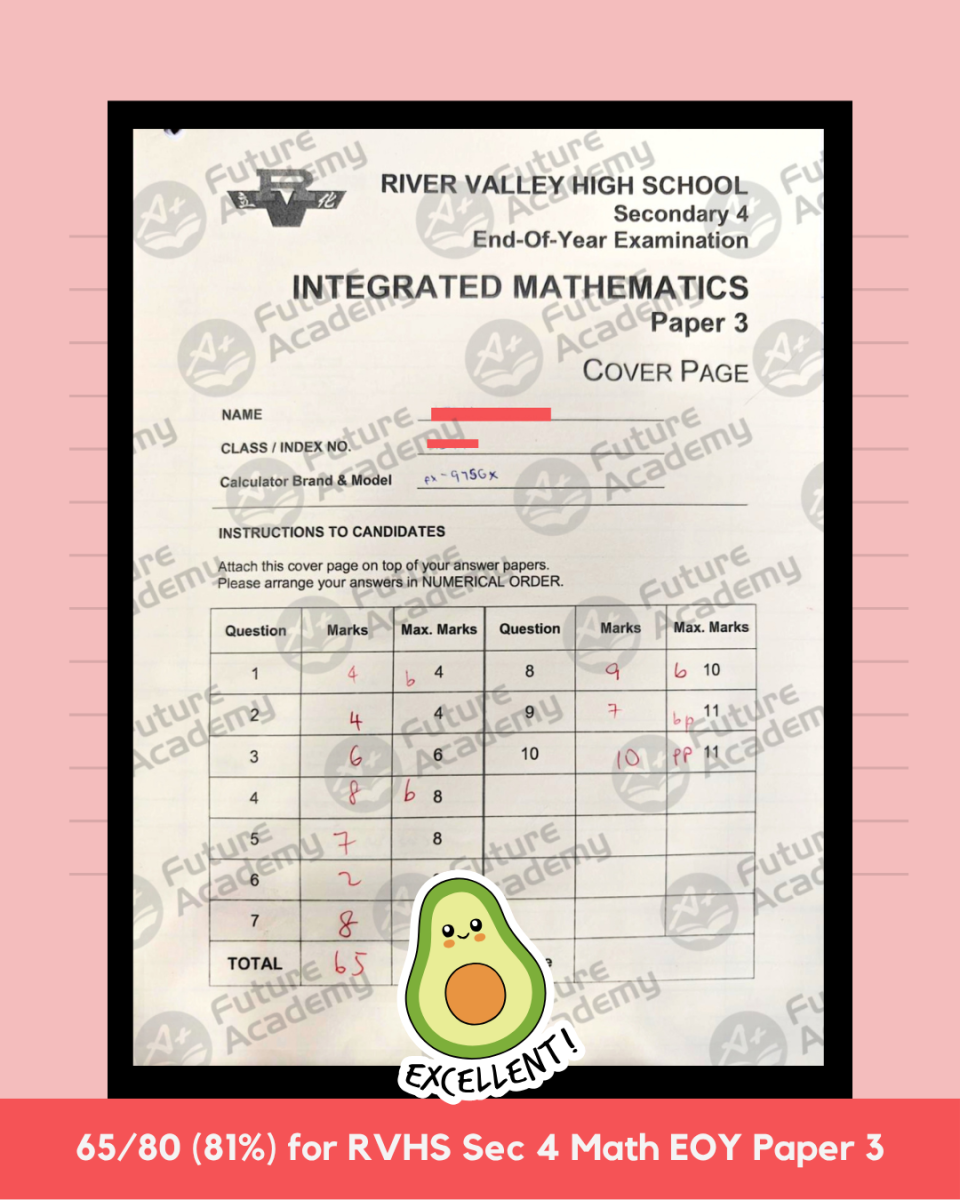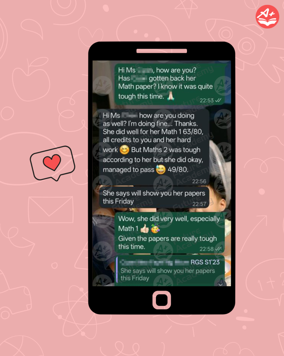 “I am so amazed and blown away by my tutor’s teaching skills. I improved my math marks from a fail to above pass. 10 marks improvement! If you thought you’re a lost cause for math or science, YOU WILL ACTUALLY GET BETTER OVER HERE. And also the prices are affordable, and the admin is super chill, so you should come to Future Academy!” – Lavender