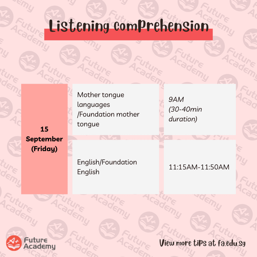 Most primary school students take 4 subjects: English, Math, Science, and their Mother Tongue Language. Some may also take Higher Mother Tongue. The main written papers usually take place over 5 days, with one subject on each day. There are also oral and listening comprehension papers which take place earlier than the written papers.