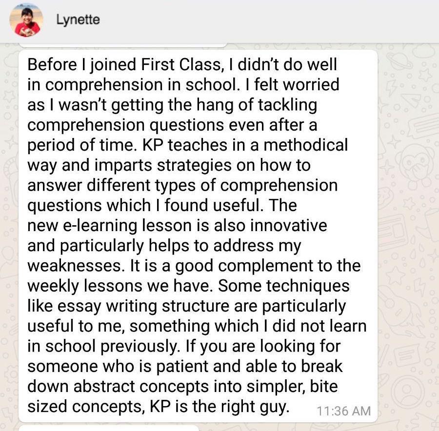 Before I joined First Class, I didn’t do well in comprehension in school. I felt worried as I wasn’t getting the hang of tackling comprehension questions even after a period of time. KP teaches in a methodical way and imparts strategies on how to anser different types of comprehension questions which I found useful. The new e-learning lesson is also innovative and particularly helps to address my weaknesses. It is a good complement to the weekly lessons we have. Some techniques like essay writing structure are particularly useful to me, something which I did not learn in school previously. If you are looking for someone who is patient and able to break down abstract concepts into simpler, bite sized concepts, KP is the right guy.