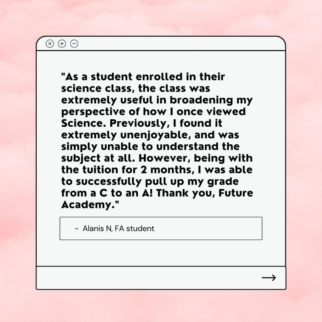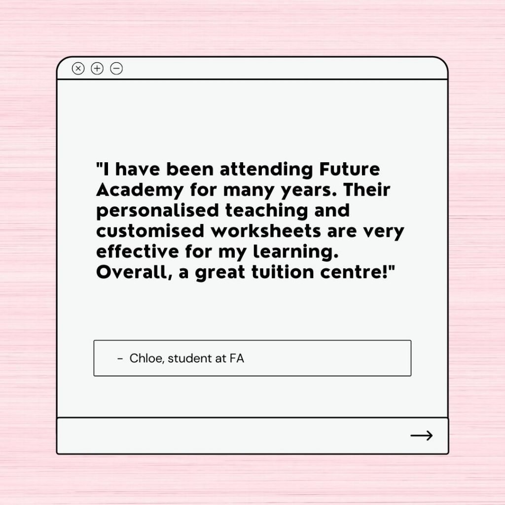 At Future Academy, you will be allocated a class that suits your school curriculum and pacing, led by one of our capable tutors. If you have friends from the same school who also want to go for tuition, we can even form a new ‘schools-exclusive’ class for you and your friends!