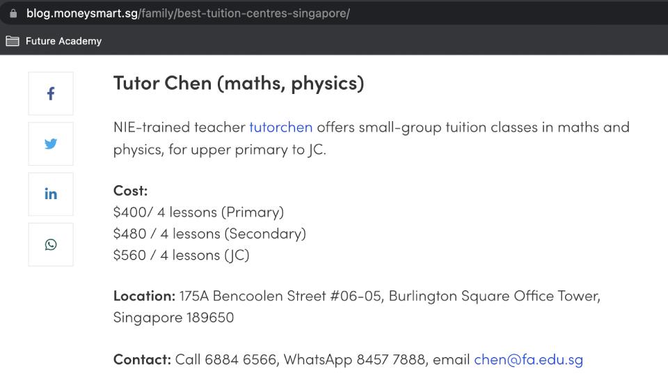 Once again, we would like to thank MoneySmart for the feature! As highlighted by MoneySmart, we provide tuition that is well-loved by students at reasonable and competitive rates. If you think of tuition fees as an investment, make sure to choose wisely and maximise your ROI by choosing the right tutor/tuition provider!