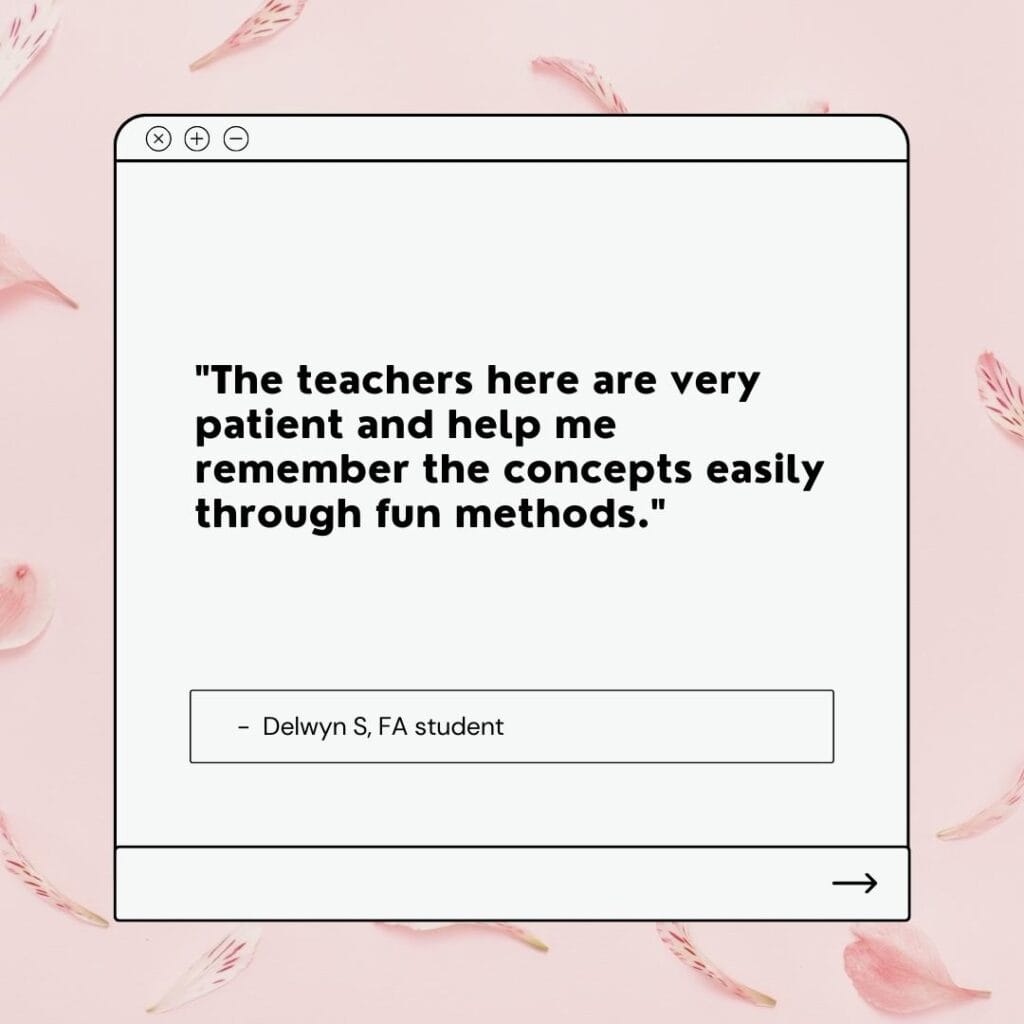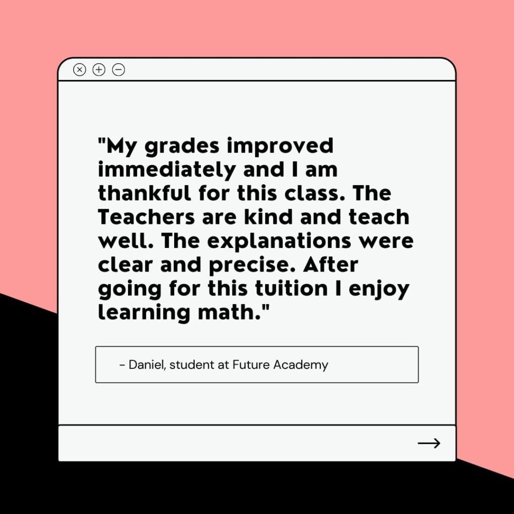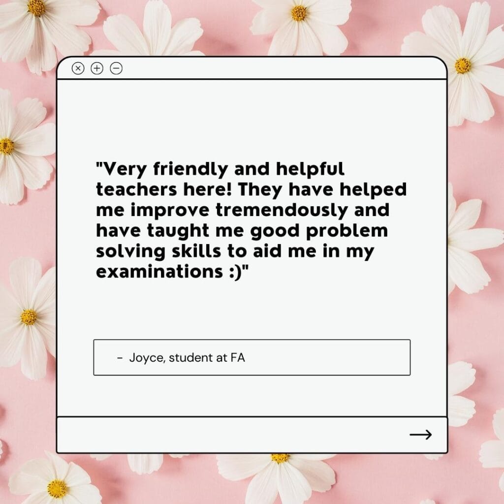 If you decide that you need tutoring to guide you in exam preparation to avoid last-minute stress, we’re here for you! Be it IP Chemistry tuition or IP English tuition, we have it. Rather than adding to your stress, classes at Future Academy are engaging and nurturing, thanks to our patient and friendly tutors. Our students tell us they look forward to lessons each week, and they enjoy learning and building up their confidence in their weakest subjects.