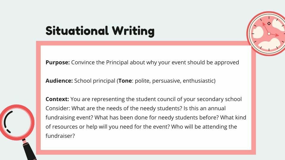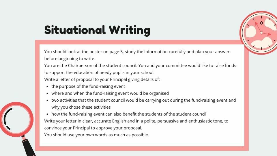 While students are not expected to write a lot for the situational writing portion, it means that you need to do more with fewer words. Your word choice and content becomes more important, as you can’t afford to waste time and words on unnecessary details or repetitions.