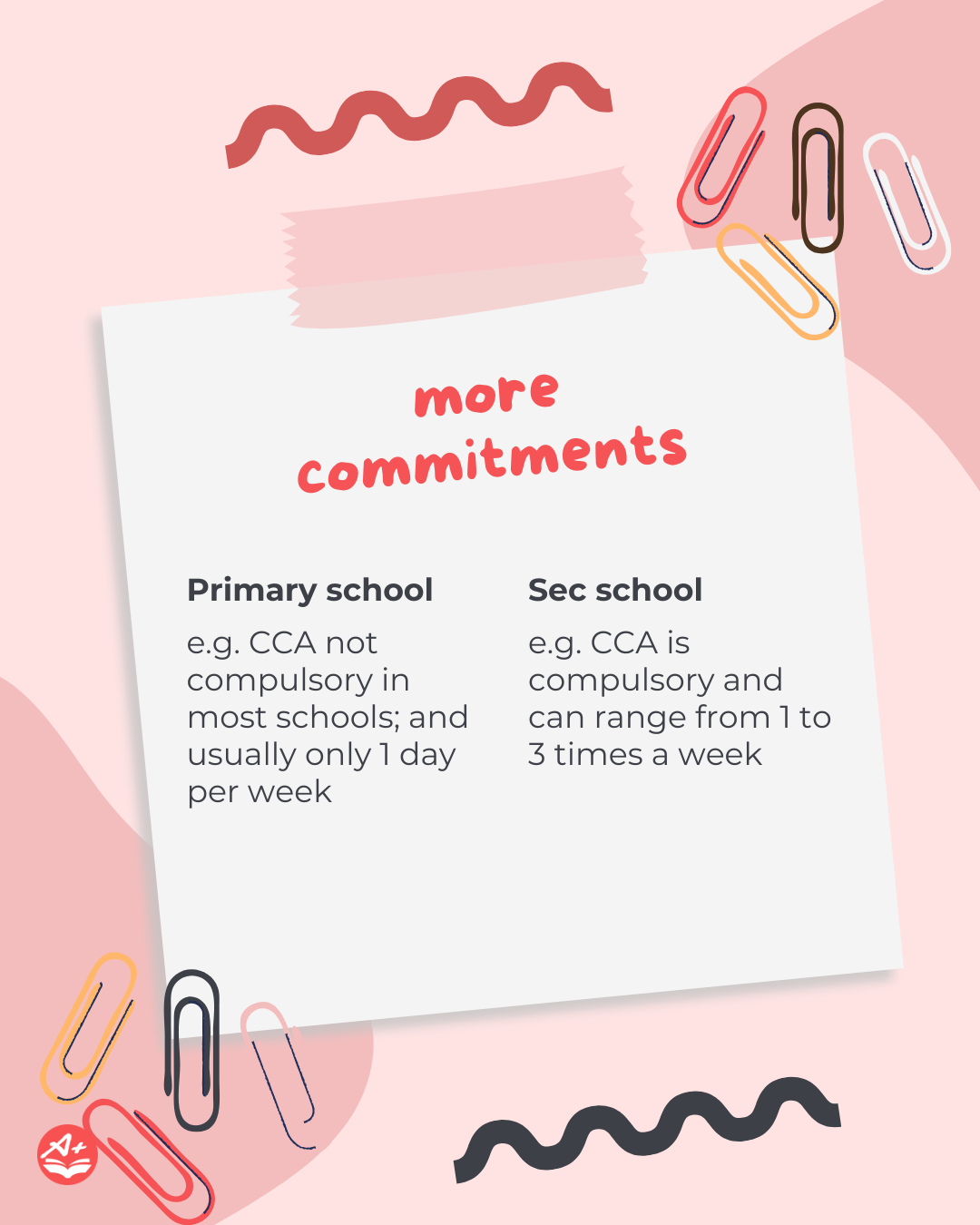 The average secondary school student is definitely more busy than a primary school student. On top of academic work, most schools require students to join at least one CCA. Some students will also take up leadership roles which come with extra commitments like training, meetings, and event planning. Some students may join extra programmes like service learning projects, research projects, or talent programmes.