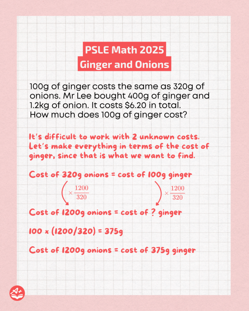 This question about ginger and onions is a test of your ability to convert and substitute values. It uses similar principles to proportion and rate. This question is a little tedious, though, so students need to be very careful to present their workings clearly so that they don’t confuse themselves and do wrong calculations.